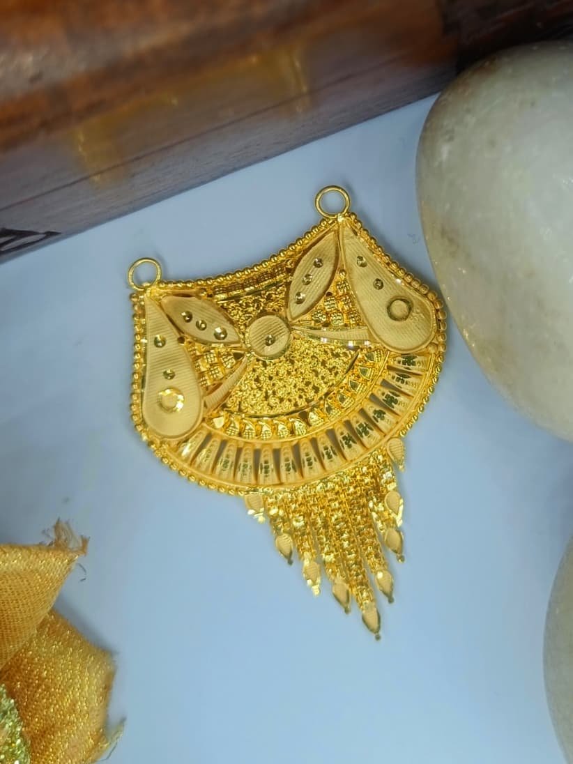 Add a royal charm to your jewellery collection with this Gold Plated Traditional Pendant from MS Jewellers. Featuring a beautifully crafted fan-shaped design with intricate embossing and fine detailing, this pendant reflects the rich artistry of Indian jewellery heritage. The layered pattern and delicate hanging drops enhance its elegance, making it an ideal centerpiece for mangalsutras or festive chains. Crafted with premium gold gram plating, it ensures a long-lasting shine and a luxurious look.