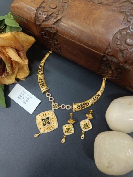 Add grandeur to your festive look with this Gold Plating Turkish Heavy Haar from MS Jewellers. Crafted with precision, this haar showcases intricate Turkish-inspired motifs combined with fine Indian artistry. The detailed floral cutwork, delicate layered patterns, and graceful hanging drops highlight its luxurious appeal. Paired with matching earrings, it makes a perfect choice for weddings, festive occasions, and special celebrations.