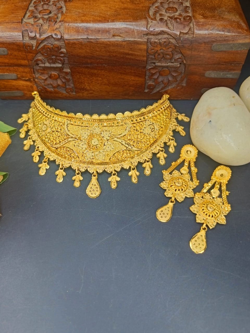 Celebrate tradition and elegance with this Royal Indian Gold Plated Choker Set from MS Jewellers. Crafted with precision, this choker showcases intricate Indian filigree work, delicate motifs, and hanging teardrop charms that add graceful movement. The rich gold gram plating offers a luxurious shine, making it an ideal choice for weddings, festive occasions, and cultural celebrations. The matching long-drop earrings complement the choker beautifully, completing the regal look.