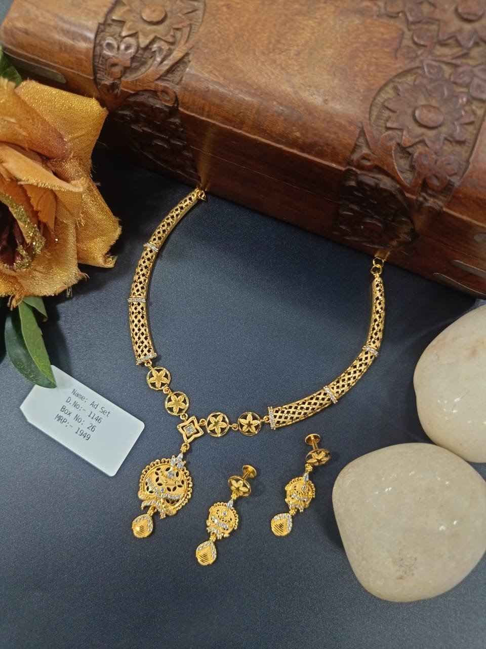 Bring home the beauty of timeless Indian craftsmanship with this exquisite Traditional Floral Gold Plated Necklace Set from MS Jewellers. Inspired by classic Indian jewellery designs, this set features an intricate floral motif adorned with shimmering CZ stones and a vibrant ruby-red centerpiece. The gold gram plating enhances its royal charm, while the engraved detailing reflects the artistry of skilled Indian craftsmen. Paired with matching floral earrings, this set is perfect for weddings, festive celebrations, and cultural occasions.